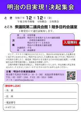 機関誌『真世界』12月号22ページに掲載いたしました、明治の日推進協議会主催の「明治の日実現決起集会」ですが、